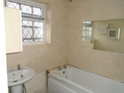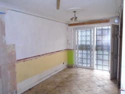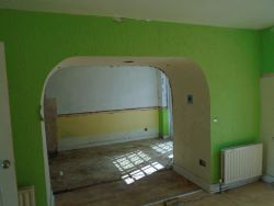 An internal wall between two of the bedrooms has been removed and so has the wall between the kitchen and living room. The kitchen fittings have all been removed.