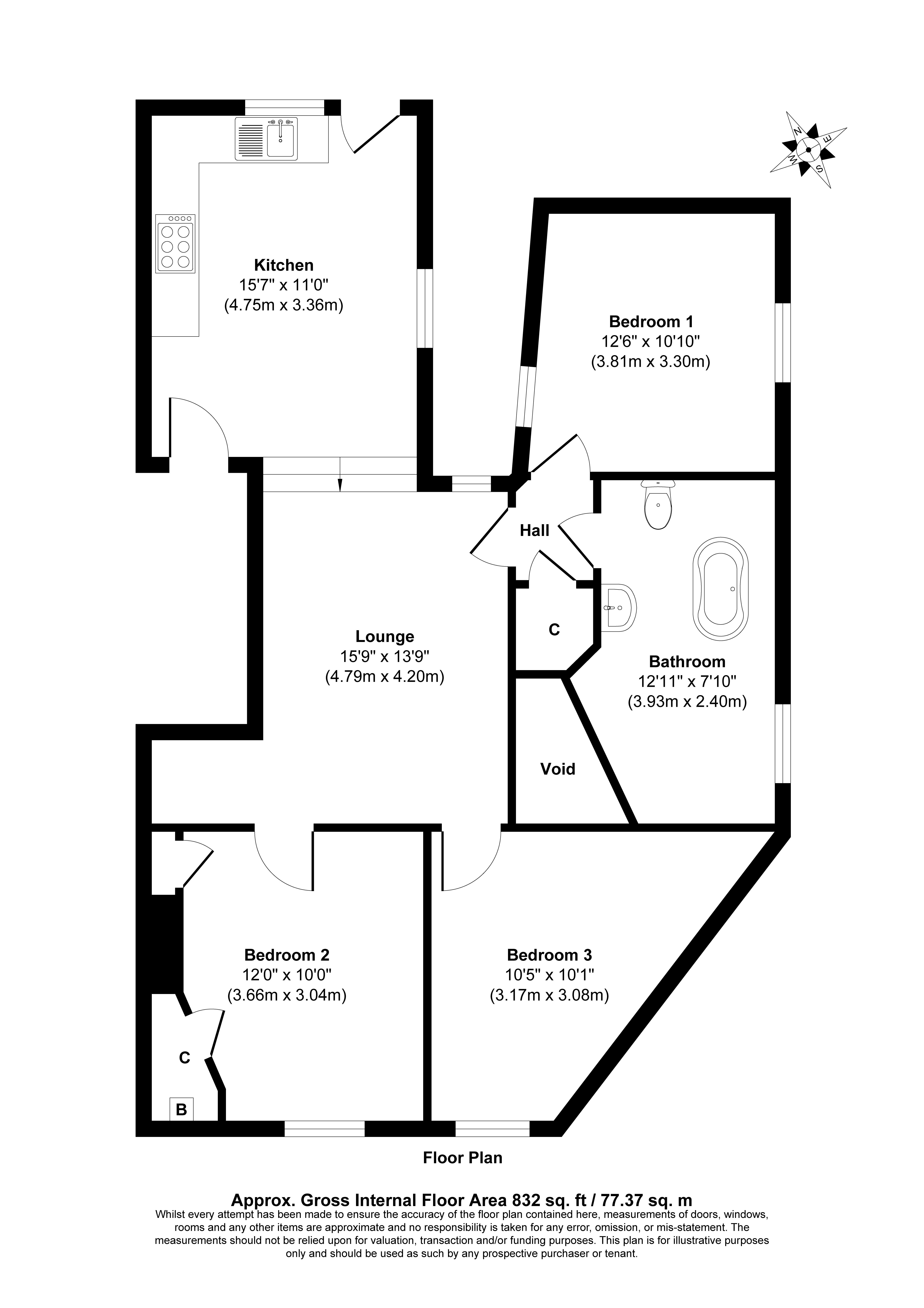 Second Floor: Kitchen/Lounge, Bathroom and Three Bedrooms