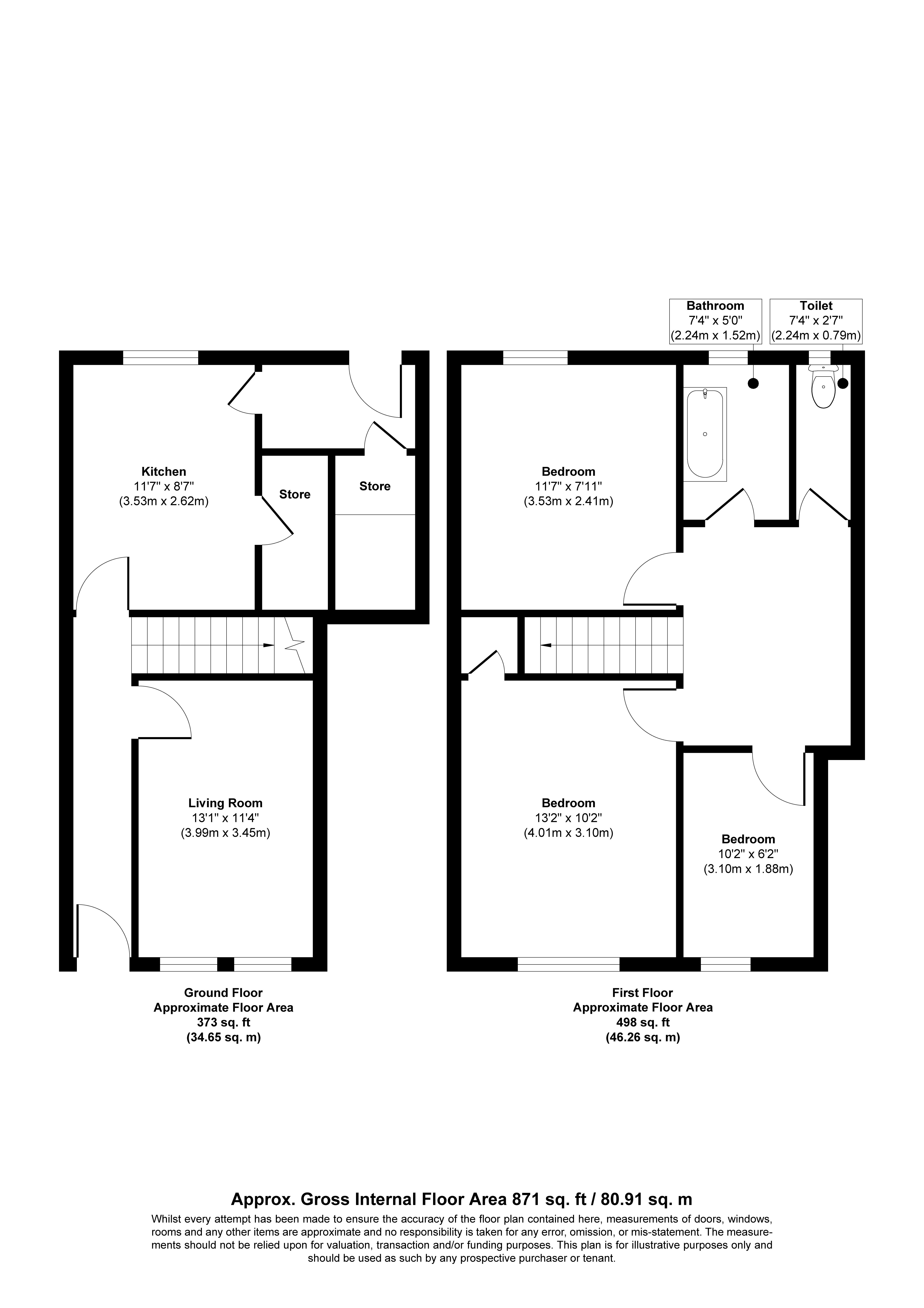 First Floor: Three Bedrooms, Bathroom and Separate W.C