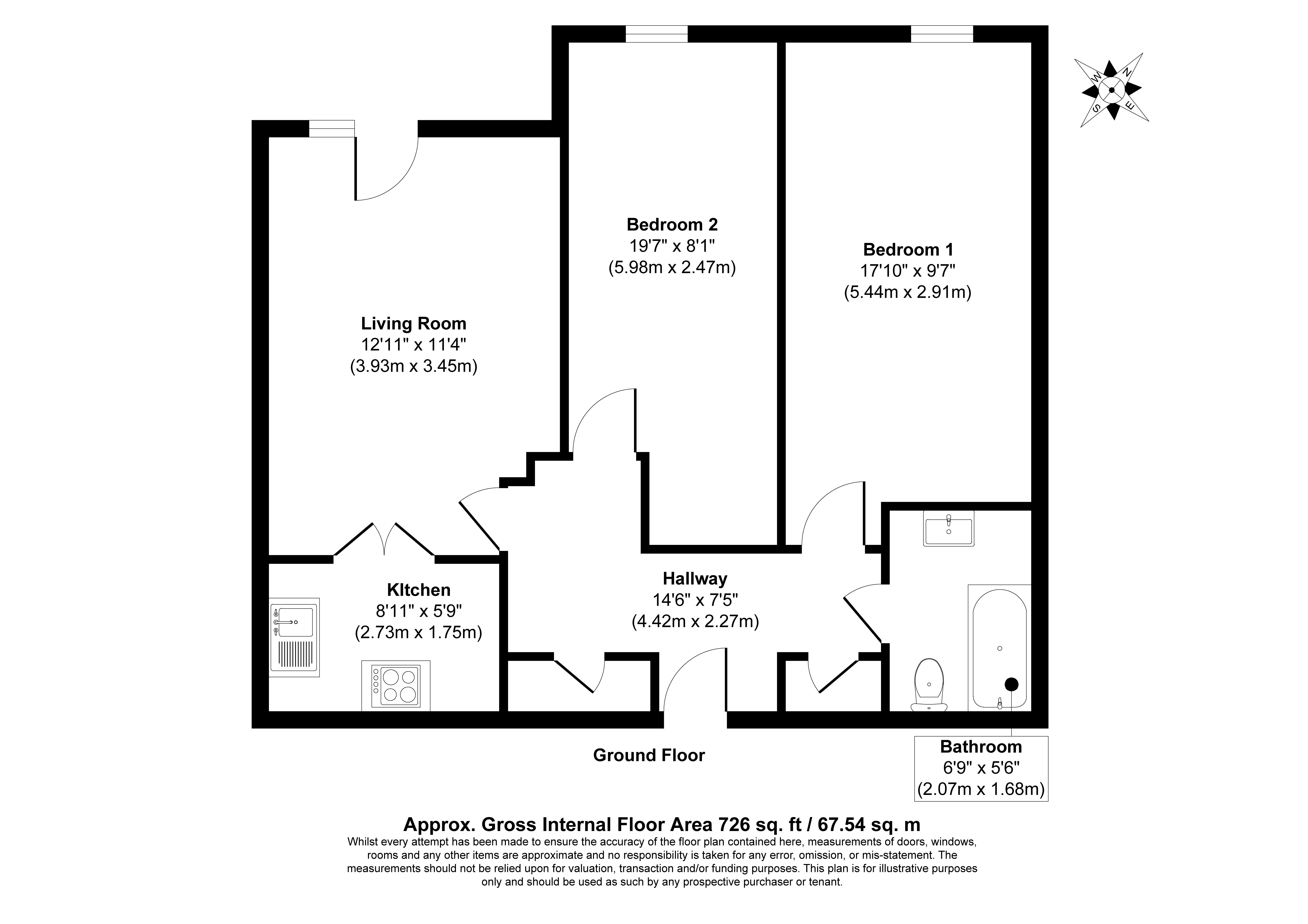 Hall, Kitchen opening to Living Room, Two Bedrooms and Bathroom/W.C