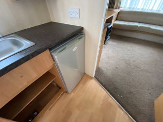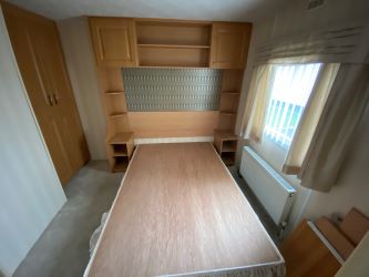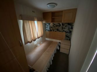Second-hand caravan in need of refurbishment. With two entry doors, one leading to the kitchen, the other to the lounge, 2 bedrooms and a bathroom with a WC, basin and shower cubicle.