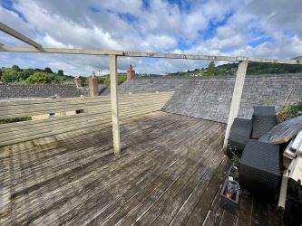 The property is situated on a quiet no-through lane with a small flower border sitting to the right hand side of the property. From the door on the rear hallway, an outside gravel area and wooden steps lead up to the roof terrace. The property does not have a garden or allocated parking.